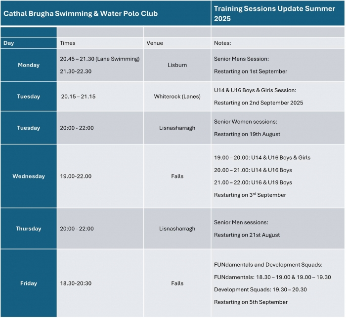 Further details are available at http://cathalbrughawaterpolo.com/training-fixtures/